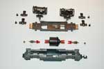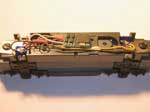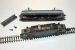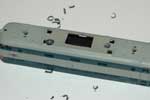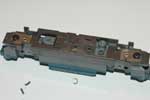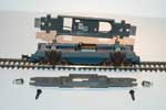 Per prima cosa si smonta completamente la loco: allentando le due viti alle estremità si può sollevare la prima sovrastruttura, in plastica, che accoglie il circuito elettrico e quindi le lampadine e la zavorra sottostante, che oltre al compito di appesantire la loco ha anche la funzione di sede superiore delle viti senza fine collegate ai carrelli.