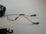 Quindi facciamo passare il filo arancione nell'interstizio tra il motore ed il telaio, poi lo accorciamo e lo saldiamo all'altro polo.